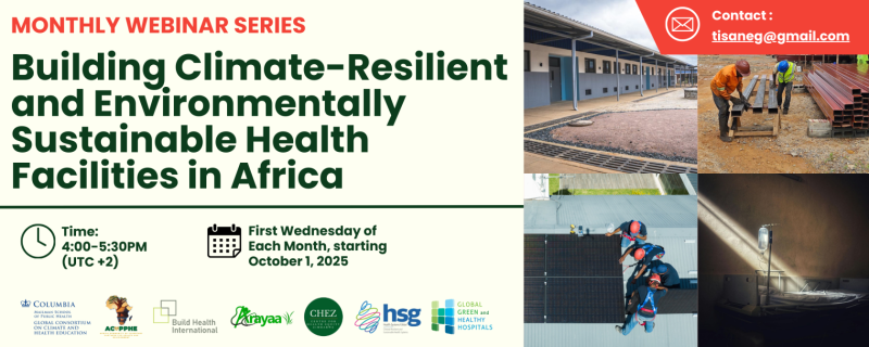 The Global Consortium on Climate and Health Education (GCCHE), the Centre for Health Equity Zimbabwe (CHEZ), ARAYAA, Build Health International, and the Africa Community of Planetary Partners for Health and Environment (ACOPPHE) are launching a monthly webinar series to spark expert-led and research-backed dialogue on climate resilient health systems in Africa. This webinar series explores the many opportunities that currently exist to integrate adaptation and mitigation efforts into health system operations as well as practical guidance for how to scale up efforts to drive impactful change across sites and scales.