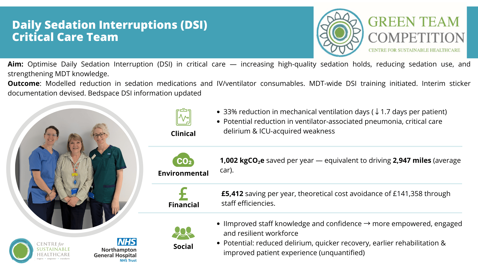 Critical care and pharmaceuticals have been identified as carbon hotspots within the NHS; they are both major contributors to NHS carbon emissions and have significant financial implications. The introduction of DSI’s within critical care has the potential to improve patient outcomes, reduce environmental and financial costs, whilst delivering social value.