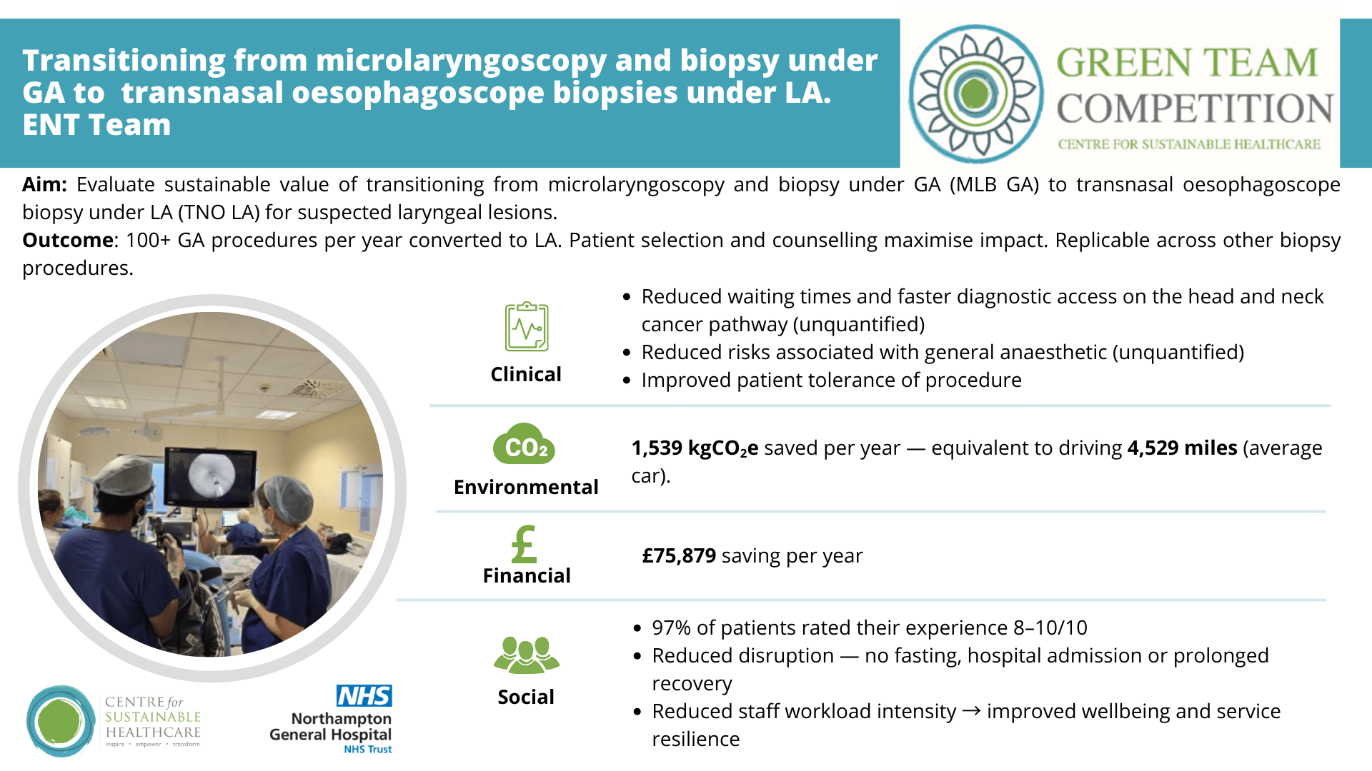 Strong clinical leadership and close collaboration between ENT, anaesthetic and theatre teams enabled the change, improving patient selection and counselling. Most carbon savings came from reduced staffing and staff travel, underlining the need for wider low‑carbon commuting initiatives. Early challenges included managing patient tolerance and maintaining GA access for those who need it. The LA TNO pathway is now embedded in routine practice, is easily transferable to other ENT services, and has the potential to reduce diagnostic delays, improve access, and support NHS net‑zero goals.