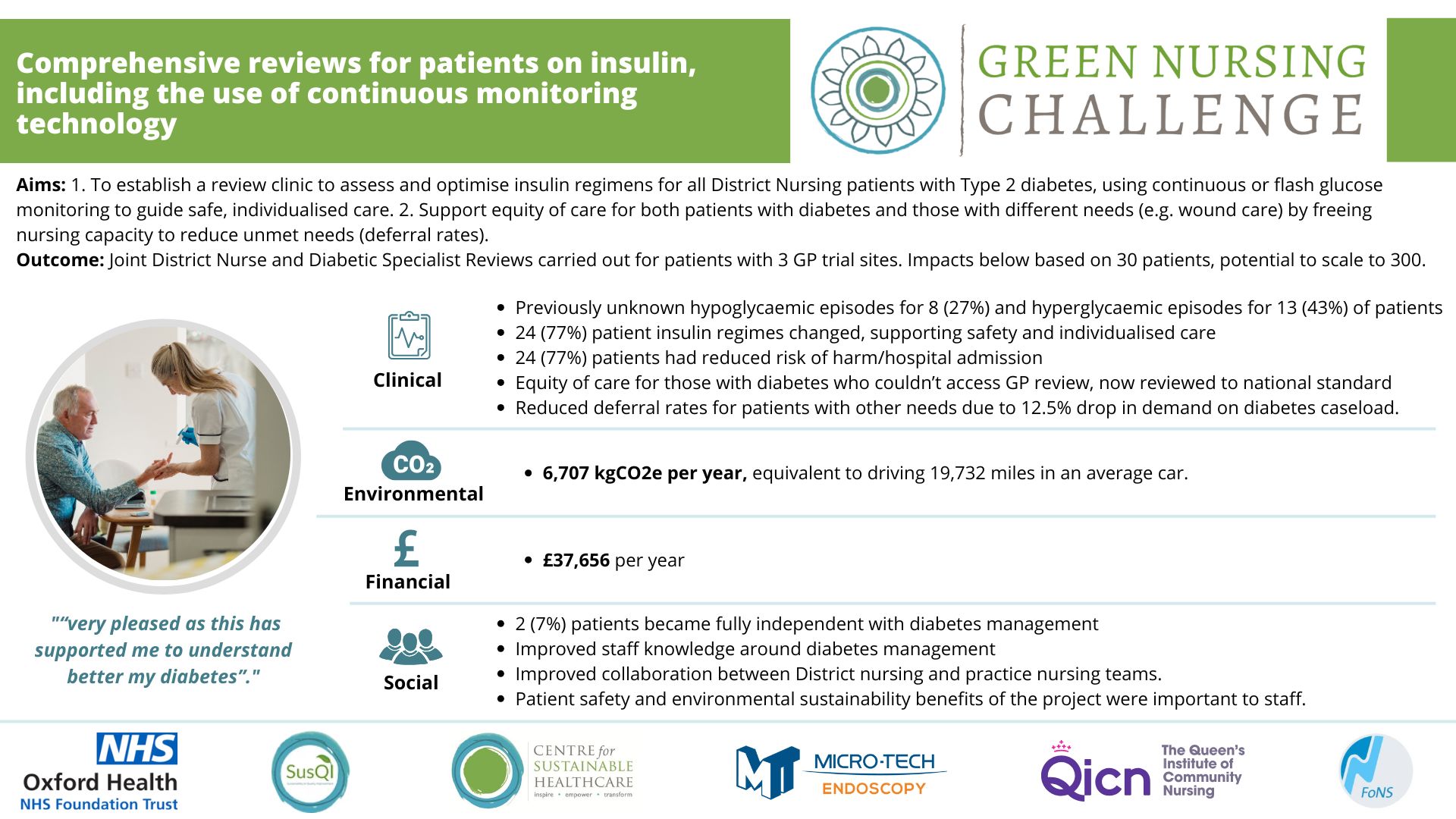 Proactive, collaborative reviews of insulin regimens, especially using continuous glucose monitoring, can significantly improve patient safety, reduce unnecessary interventions, and free up nursing capacity. The project demonstrated that integrating primary and community care teams to review housebound patients not only enhances clinical outcomes and equity of care, but also delivers measurable environmental and financial sustainability benefits.