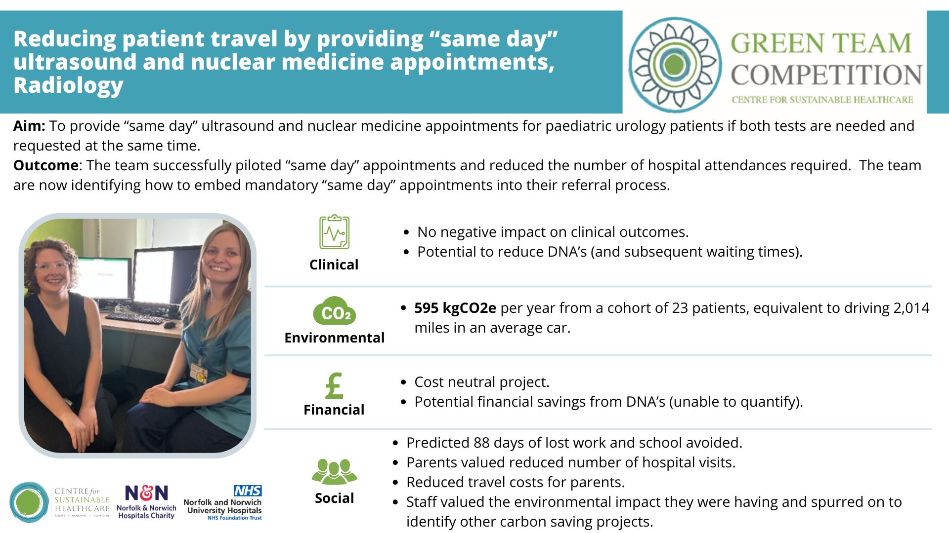 Reducing patient travel by providing “same day” ultrasound and nuclear medicine appointments. This project was part of the 2025 Green Team Competition at Norfolk and Norwich University Hospital (NNUH), implemented by the radiology department.