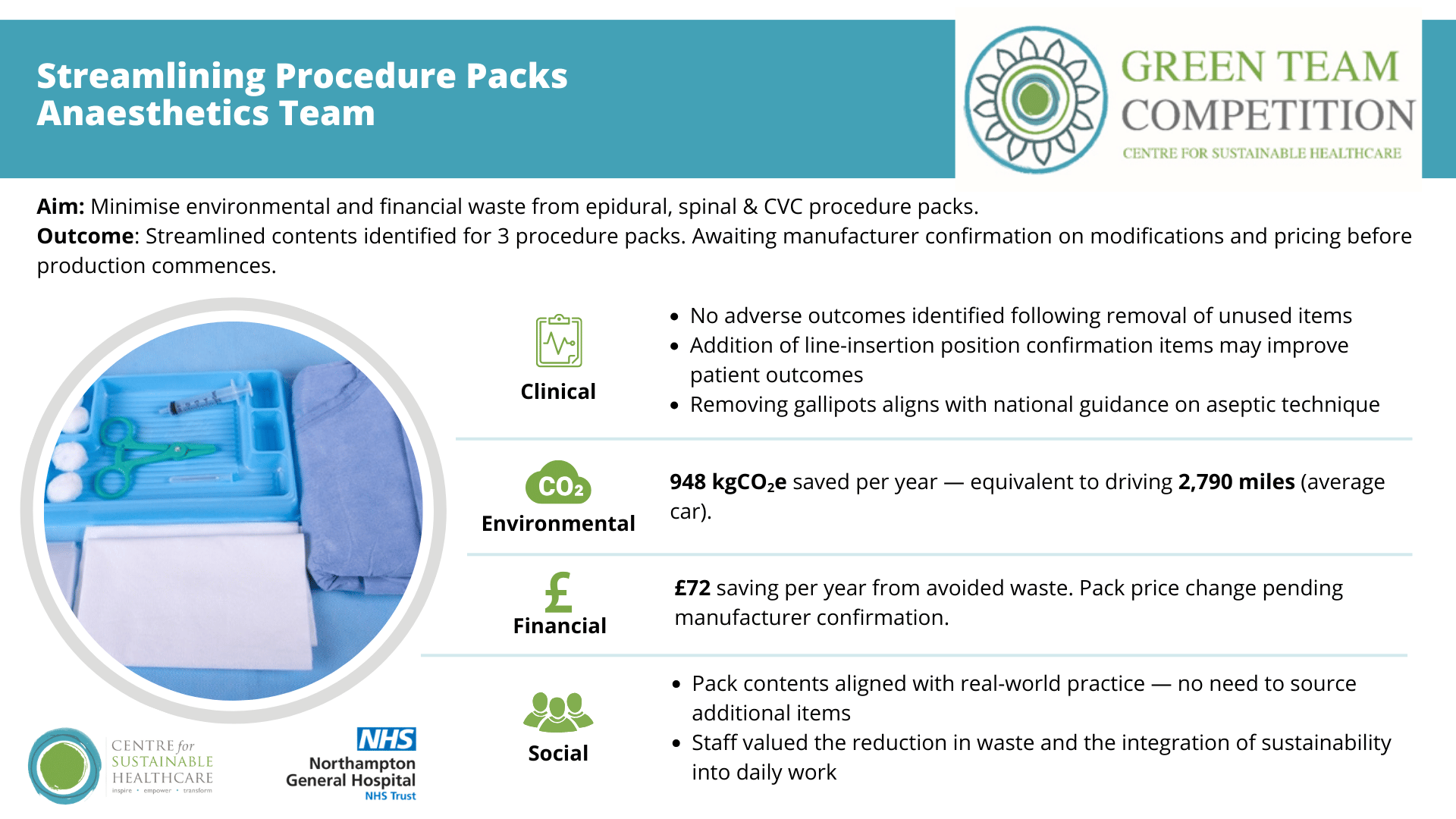 The project demonstrated the value of clinician driven reviews of preassembled procedure packs and highlighted how sustainability and patient safety can be advanced together. Early engagement with procurement and suppliers is essential, as modification of pack contents is constrained by manufacturers.