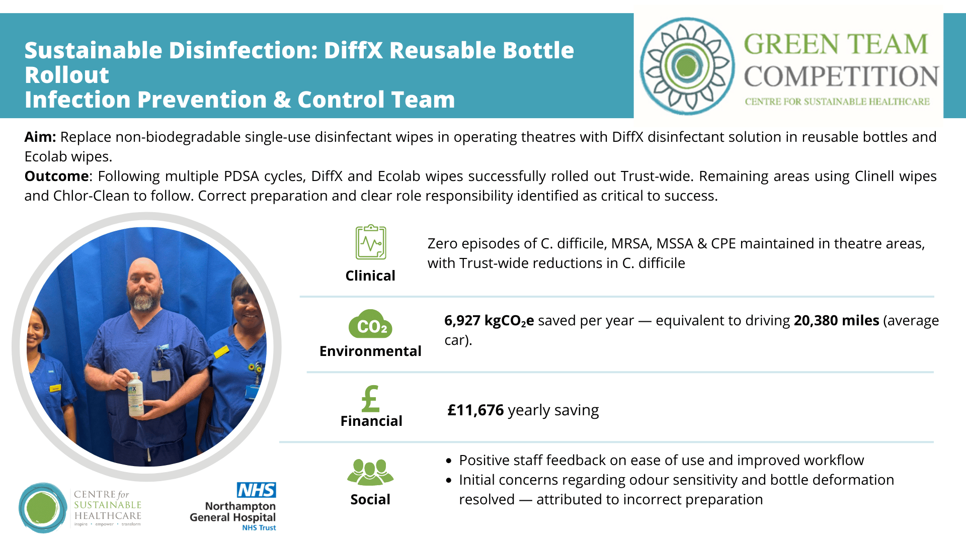 Operating theatres undergo frequent cleaning cycles, relying heavily on single use Clinell wipes and ChlorClean tablets. This created significant plastic waste, high carbon emissions, and recurring consumable costs. Chlorine products also carried risks including equipment corrosion, respiratory irritation, and reduced efficacy in the presence of organic matter. The project aimed to introduce DiffX, a sporicidal, pH neutral-neutral, biodegradable disinfectant, delivered via reusable bottles, reducing both environmental impact and reliance on disposables.